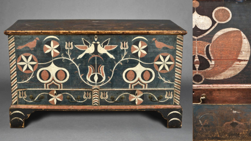 Explore the bold painted geometric designs of early 19th-century cabinetmaker Johannes Spitler. Working in the late 18th and early 19th centuries in Virginia’s Shenandoah Valley, Spitler drew upon his Swiss and German heritage to ornament local joiners’ work with brilliant, symbol-laden designs. His painted chests and clock cases—adorned with stylized birds, hearts, crescent moons, tulips and compass-drawn flowers—reflect a worldview in which every motif carried meaning: abundance, faith, love, fertility, and spiritual growth. The vines and flowers that entwine his designs speak not only to the natural cycles of an agrarian life but also to the inner flowering of the human spirit.